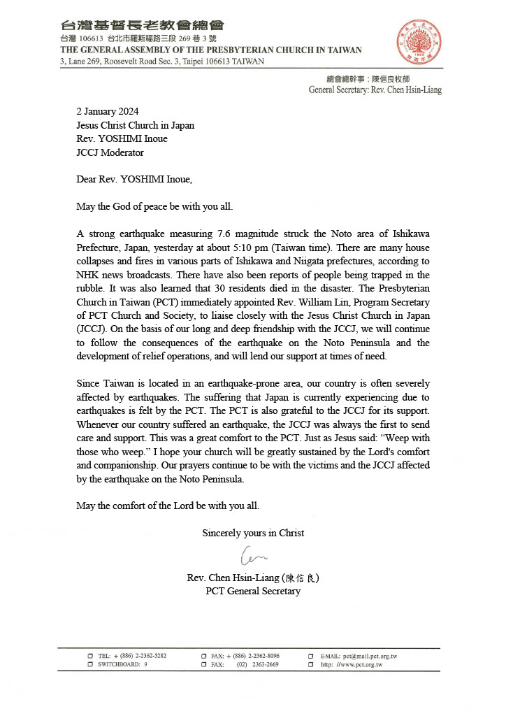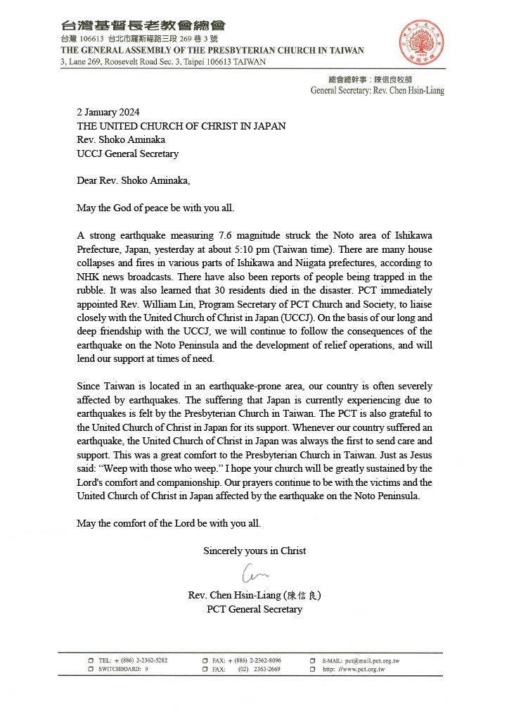 附件:Sr64035d-為日本哈吉貝風災募款代禱信.pdf (470 kb)附件:2018年西日本水災義工團重建報告.pdf (2255 kb)附件:2021為日本靜岡熱海土石流 捐款徵信-線上捐款.pdf (1710 kb)附件:1627887433_2021-07-30-日本震災報報告.pdf (688 kb)附件:JCCJ回覆感謝函.pdf (203 kb)附件:JCCJ_Condolences_from_the_Presbyterian_Church_in_Taiwan_(PCT).jpg (134 kb)附件:UCCJ_Condolences_from_the_Presbyterian_Church_in_Taiwan_(PCT).jpg (142 kb)